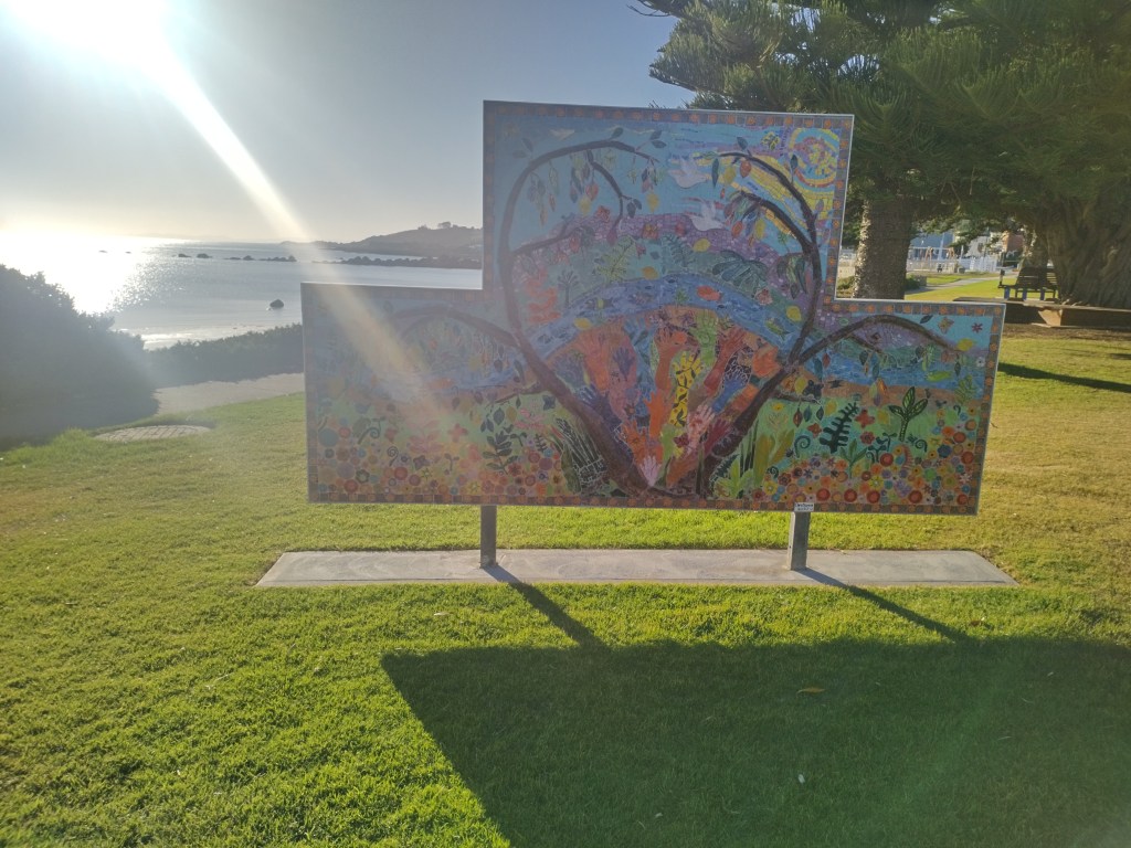 When we arrived off the Spirit of Tasmania late at night we decided to travel a bit further and ended up at Midway point aka Sulphur Creek. It was a 1/2 hour drive. We came to our first free camp on this journey and the camp was packed. Most of the campers were asleep so as we manoeuvred our way around with the bells and whistles going off in the car we finally found a spot….on the driveway who cares, free camp is just that.